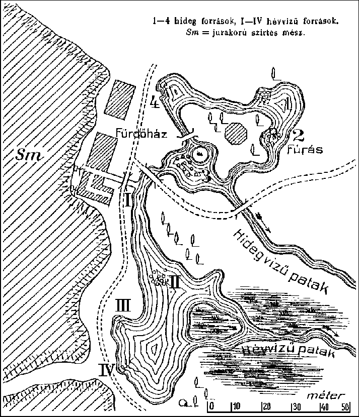 A Miskolc-Tapolcai egykori hideg és langyos források helyszínrajza (Papp K., 1907.)