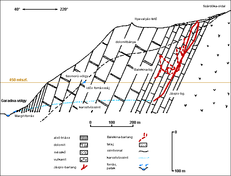 A Nyavalyás-tető metszete, a barlangok helyzete (40°-240°)
