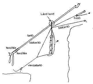 5.2.3. A harmadik lesz a húzókötél, ami ugyanazt a szerepet játssza mint az aknákban való fel- vagy lemenetelkor. Kiépítünk rá egy húzórendszert vagy két ereszkedőgépet igény szerint, és visszaereszthető csigát, ha szükséges.
