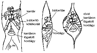 A két biztosítókötélnek jól megkülönböztethetőnek kell lenni! Az egyik a hordágyhoz, másik az ellensúlyt alkotó mentőhöz megy.
