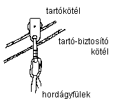 5.2.2. Kell egy tartó/biztosító kötél is, kevésbé megfeszítve, mint a tartókötél. A hordágyat karabinerekkel csatoljuk hozzá, amik a tartókötélen lévő csigákat is tartják.